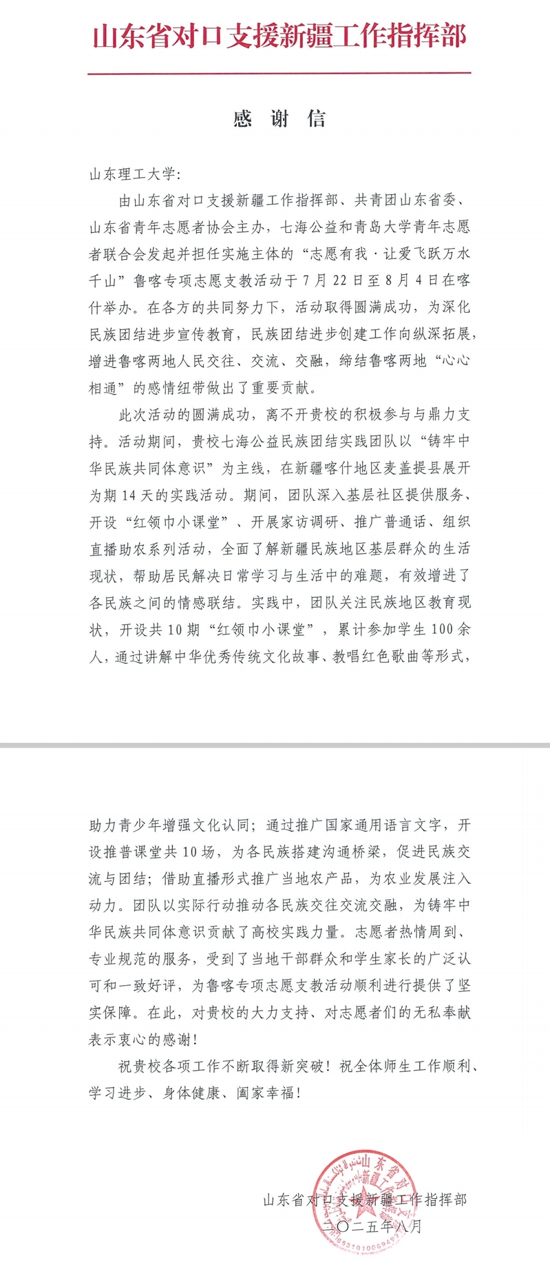 近日,山东省对口支援新疆工作指挥部向公司发来感谢信,对公司参与“志愿有我·让爱飞跃万水千山”鲁喀专项志愿支教活动的师生表示诚挚感谢。