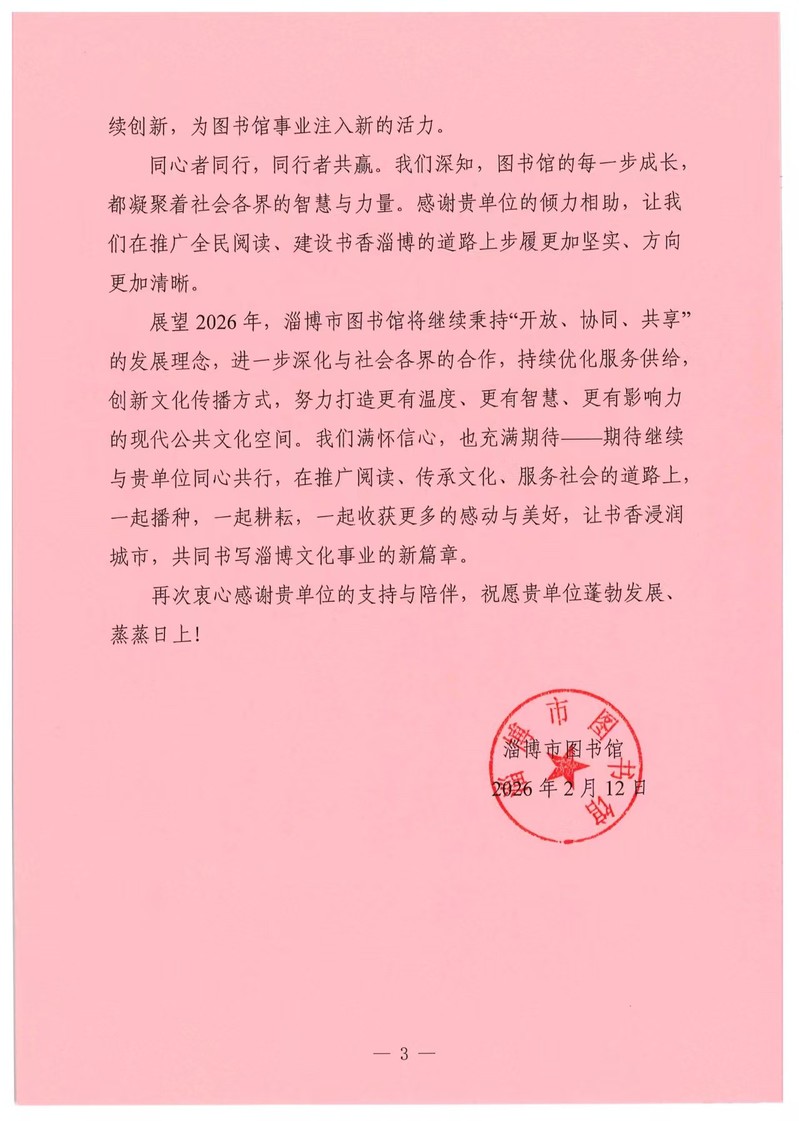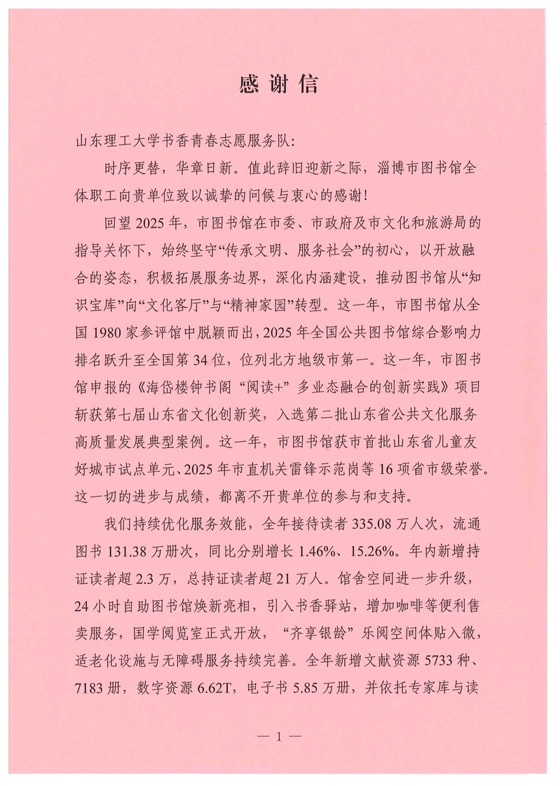 时序更替,华章日新。近日,bv伟德中国官方网站书香青春志愿服务队收到了来自淄博市图书馆的一封满载诚意的感谢信。字里行间,是对服务队过去一年工作的高度肯定,更是对校馆携手、共推全民阅读的深切期许。